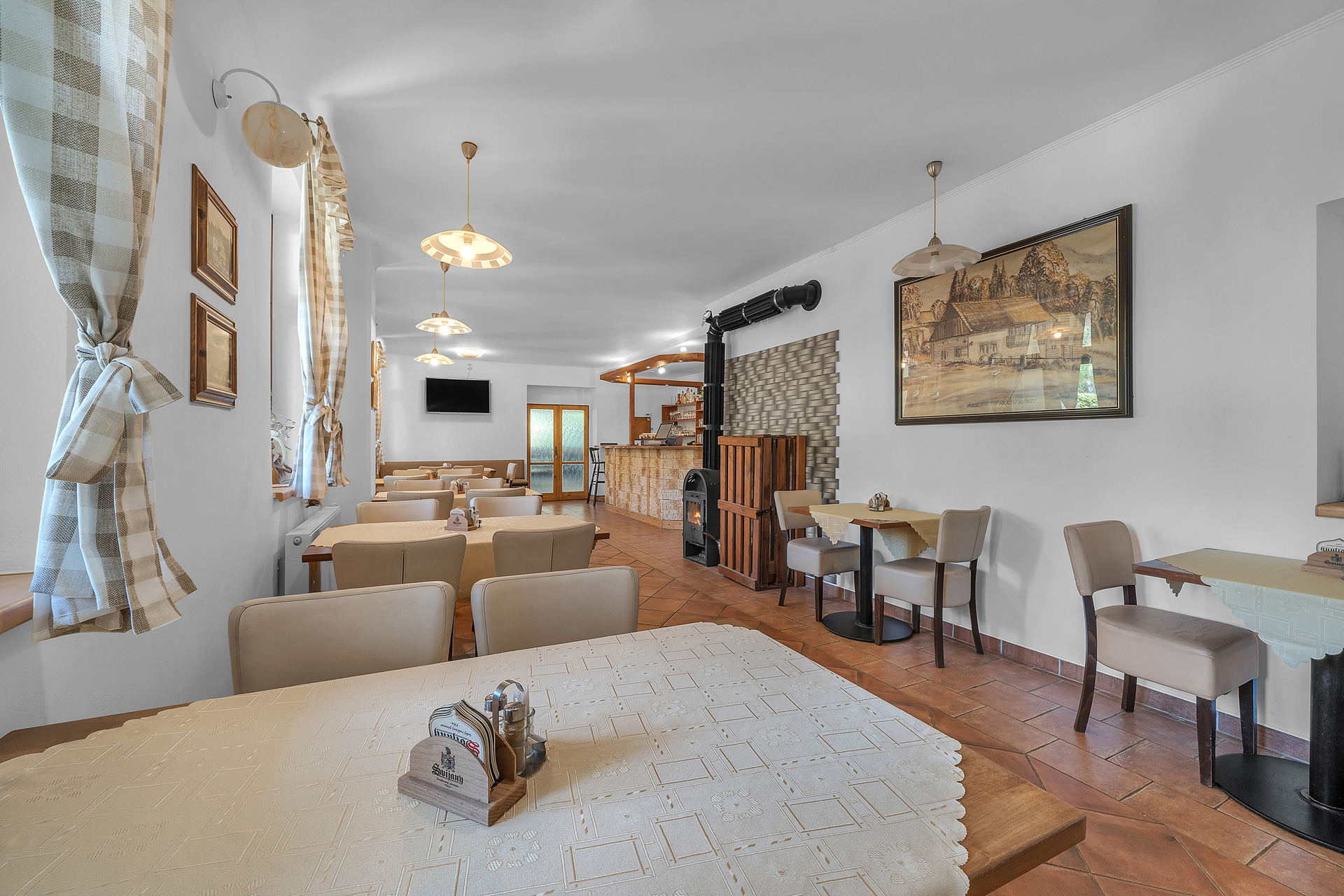 Stylová restaurace s celodenním provozem nabízí stravování nejen pro ubytované, ale také pro širokou veřejnost. V jídelním lístku si můžete vybrat jak tradiční české jídlo, tak i něco lehčího. Můžete nás kontaktovat a objednat si svatební hostinu, oslavu či jinou akci v sále s kapacitou až 70 lidí.